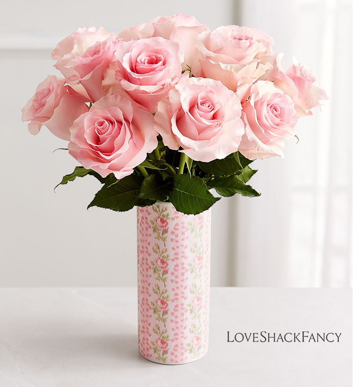 LIMITED TIME ONLY Our dreamy pink roses are the kind of gift that brings sweetness and beauty into their space. And when presented in this keepsake vase decorated with one of LoveShackFancy’s signature romantic prints, the roses are all the more memorable. Sweetening the gift: For a limited time, the bouquet comes with a sample of LoveShackFancy’s Secret Crush perfume, a warm vanilla fragrance enhanced with sophisticated notes of champagne accord, white musk, and sandalwood.